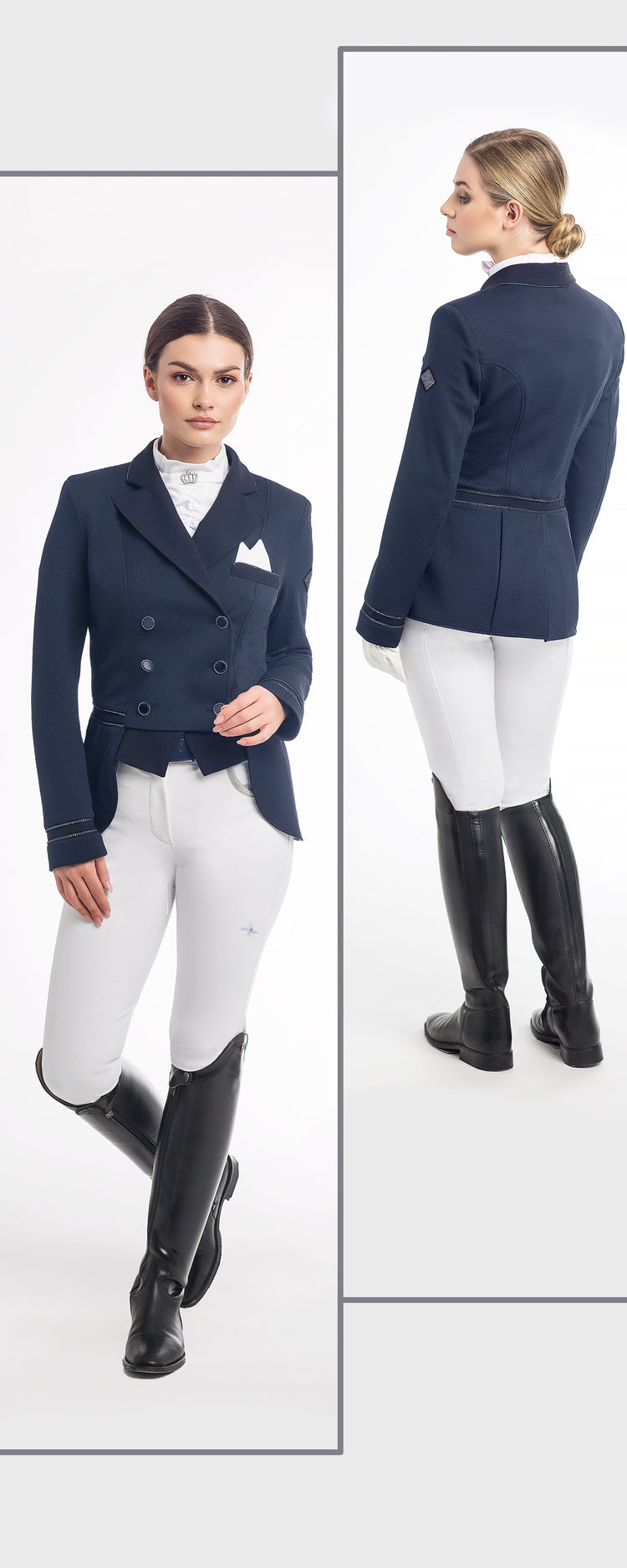 Show Jacket Elizabeth COMFIMESH™- this elegant show jacket is made from the extremely lightweight and breathable COMFIMESH™ fabric which feels great against your skin and ensures comfortable wear. Having no lining, this jacket will allow for an excellent air ventilation and prevent moisture accumulation. A white satin pocket square adds an extra special finish and makes Elizabeth a wonderful jacket choice for your competition.