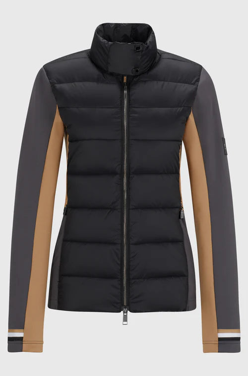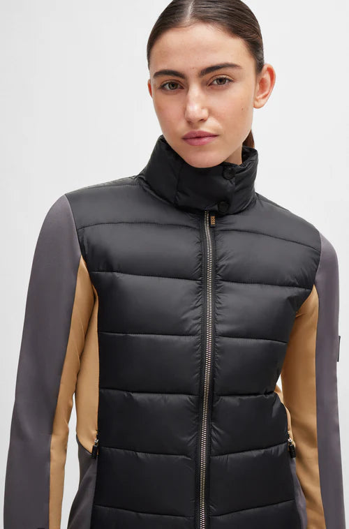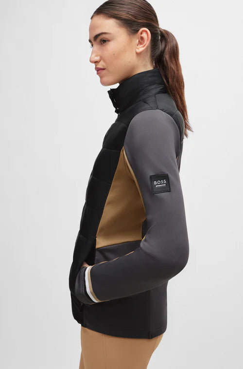 Boss Equestrian Women's Hybrid Puffer Jacket Ruby - this lightweight ladies jacket is perfect for in between seasons. Made from a combination of puffer and softshell, its designed for riding in thanks to the two way front zip. Signature stripes on the sleeve ends combine perfectly with the contrasting colored details on the sides and sleeves, whilst the extra high neck with button closures not only adds to the look, but will help keep you warm. The BOSS logo badge on the left sleeve adds the final touch to this functional jacket.