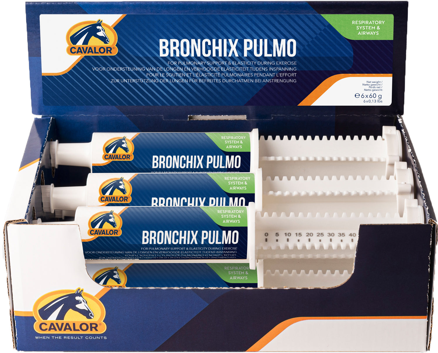 Bronchix Pulmo - Cavalor® Bronchix Pulmo opens up the airways and supports pulmonary elasticity and resilience during high-intensity training and competition. A poorly functioning respiratory system is a common factor in sport horses that don’t always quite manage to exhibit their full potential. For outstanding performance, efficiently transported oxygen is crucial. Cavalor® Bronchix Pulmo is designed for optimal support of the lungs and airways. It improves the elasticity and resilience of the blood vessels and facilitates respiration. Clinical testing on active racehorses has demonstrated these effects.