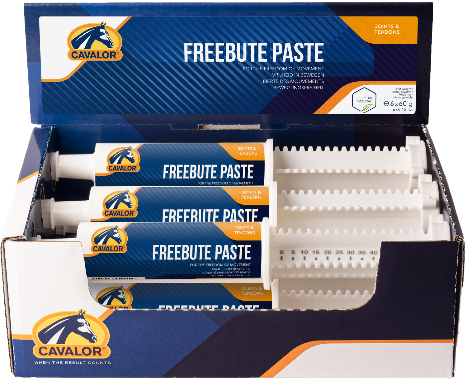 Cavalor® FreeBute Paste: 1/2 a syringe the night before and 1/2 a syringe the morning before an exertion. Riders often feel that horses benefit even more from 1 syringe the night before and 1 syringe the morning before an exertion. 1 syringe = 60 g. Maximum 240 g per day per horse (= 4 syringes).