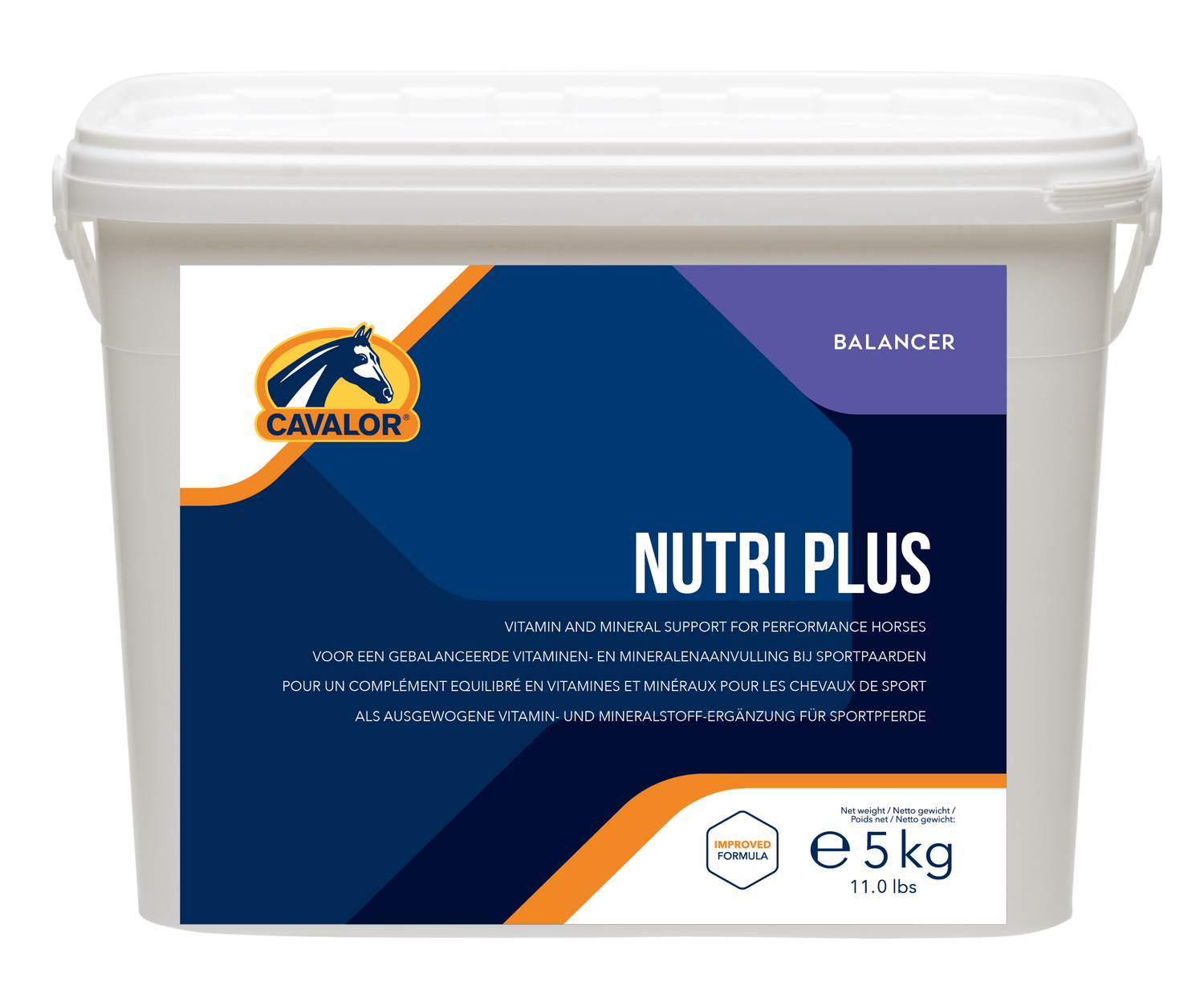 Cavalor Nutri Plus® contains vitamins A, D3, K3, B1, B2, B3, B6, B12; folic acid, choline, biotin, lysine, methionine; trace elements: copper, iron, iodine, cobalt, manganese, zinc, sodium, magnesium, calcium, phosphorus, potassium, selenium.