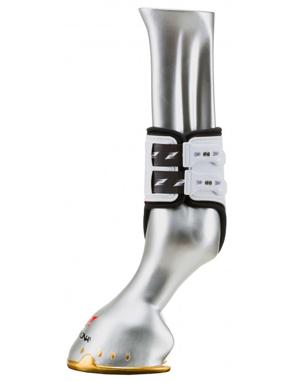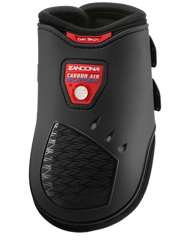 Zandona Carbon Air Balance Fetlock Boots - The 100% made in Italy "CARBON AIR BALANCE Fetlock" have been studied to defend jumping horses from collisions and bruises at hind-limb's fetlock and part of the cannon, while offering tendon support. They are composed by external TPU structure with differentiated thickness, transpiring thanks to the perforated Neoprene and ventilated by 3 Air-Vents. Gel-Tech is included between the external TPU structure and the Neoprene support, where necessary, working as shock absorber and comfortable padding. Carbon Fibre elements are present under the shell to thermally insulate the joints from the heat generated by external friction, while increasing the mechanical resistance to impacts. The elastic straps with quick-release-tip have been calibrated for a secure closing, they are in-fact provided of double locking system (horizontal\vertical). Its dimension and absolute ergonomic shape have been developed copying accurately the limb structure, guaranteeing a perfect positioning while avoiding any kind of stress. They are also equipped with a magnetic device that improve cellular function, increasing horses performance and dynamic balance. The permanent magnet used is composed of a highly magnetic alloy of Neodymium, Iron and Boron with Nickel coating, capable of exerting a magnetic flux density of 2600 Gauss. It was found in various tests with the help of veterinarians and professional riders, that the use of this device placed near the muscle-tendon apparatus greatly decrease the limbs fatigue as induce an increase in vascular blood-flow and lymphatic-circulation, with multiple beneficial effects. The benefits induced by increased vascular blood-flow and by the magnetic polarization, ascertainable on horses as humans, are anti-inflammatory and analgesic effects, bones and joint articulations strengthening, as well as acceleration of the process of toxins expulsion and of absorption of muscles lactic-acid. Those benefits lead the improvement of movements and jumping performance of the horse.