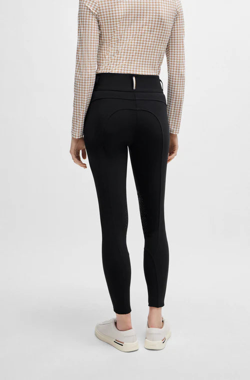 Boss Equestrian Ladies High Waist Breeches with Knee Grip Hannah - the perfect high waist women's breeches with knee grip. The high waist ensures total comfort and a flattering fit, whilst the silicone knee patch is made without seams to ensure excellent grip and total comfort. To ensure the essential BOSS look, the front pockets and middle back belt loop feature the signature colors, whilst the large phone pocket on the left upper thigh has a BOSS logo patch for a great look. Made from 4-way-stretch material for complete freedom of movement in and out of the saddle, these breeches are certain to become your favorite.