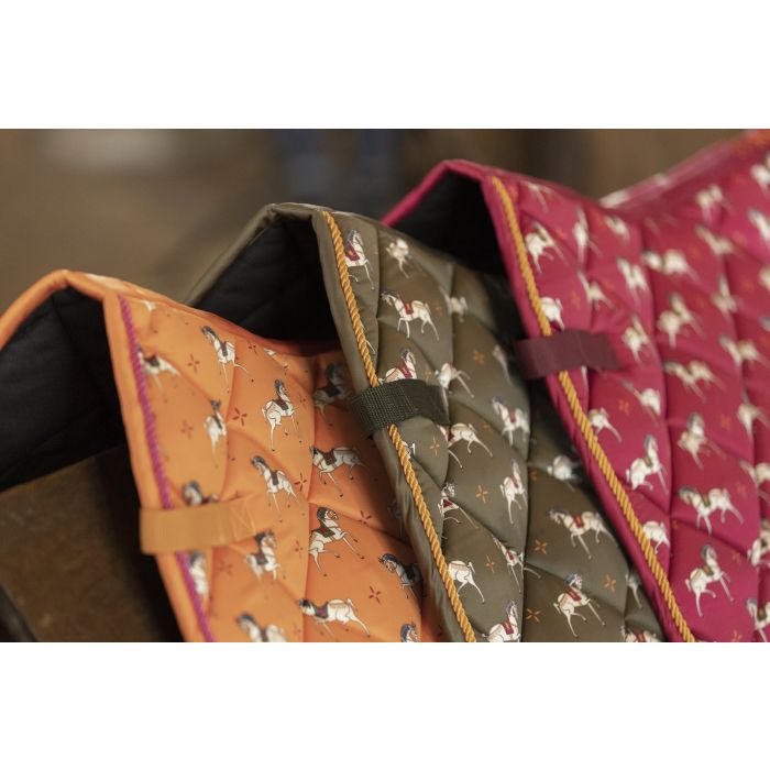 HKM Saddle Cloth Allure Cheval - This saddle cloth with its playful design is a must-have for this summer. Warm colors with an all-over print of baroque horses will make your friends look at your horse twice. On top of that, the breathable materiel, padding and anatomic fit will keep your horse comfortable all summer.