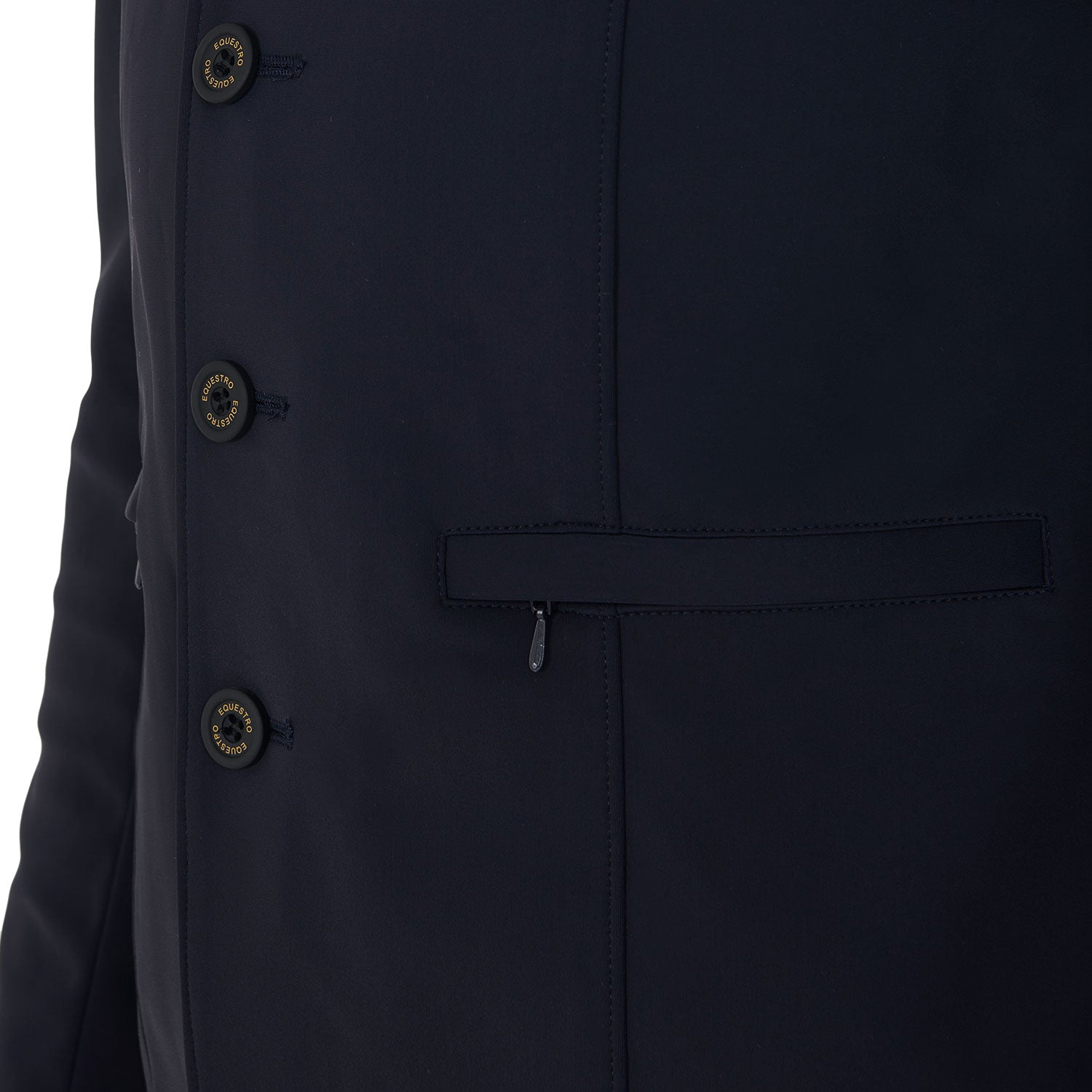 Equestro Men's Technical Show Jacket - a classic men's competition jacket with a 4 button front, made from technical fabric for incredible comfort and superior performance. Practical zipped pockets allow you to carry any essentials with you when competing, whilst the tailor fit ensures a great look. An Equestro logo on the left arm combines perfectly with the buttons to add a sporty touch.