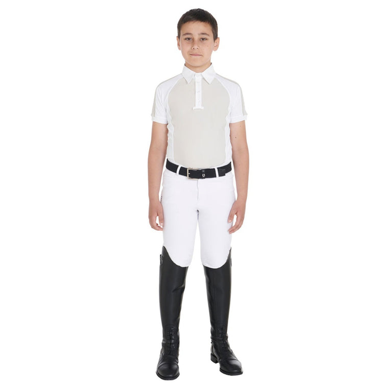Equestro Boy's Slim Fit Competition Polo with Mesh Inserts - this brilliant boys short sleeve show shirt features mesh inserts under the arms and side for improved breathability and comfort. Made from high quality technical fabric, the shirt is super stretchy for complete freedom of movement when riding. Featuring Equestro writing on the sleeve and a small Equestro logo on the collar, the shirt is certain to become one of your child's favorites.