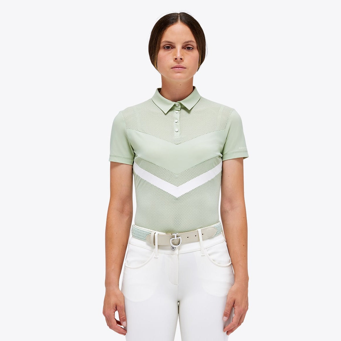 Cavalleria Toscana Women's Perforated Polo Shirt - add some color and comfort to your horse riding outfit this summer with this gorgeous polo from Cavalleria Toscana. Designed for equestrians, the shirt is made from high quality jersey mesh fabric for a great look and feel. The unique design with solid color inserts will match your light colored breeches perfectly whilst the perforated, highly breathable fabric will keep you cool when in the saddle and around the stable. It's certain to be this summers it piece!