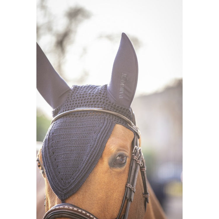 PADDOCK ear bonnet soundless long - Crafted from a thick, durable weave, this bonnet sits comfortably and securely on the horse’s head. The ears are equipped with soft inserts that protect the horse from insects, noise, and weather, helping to maintain focus.