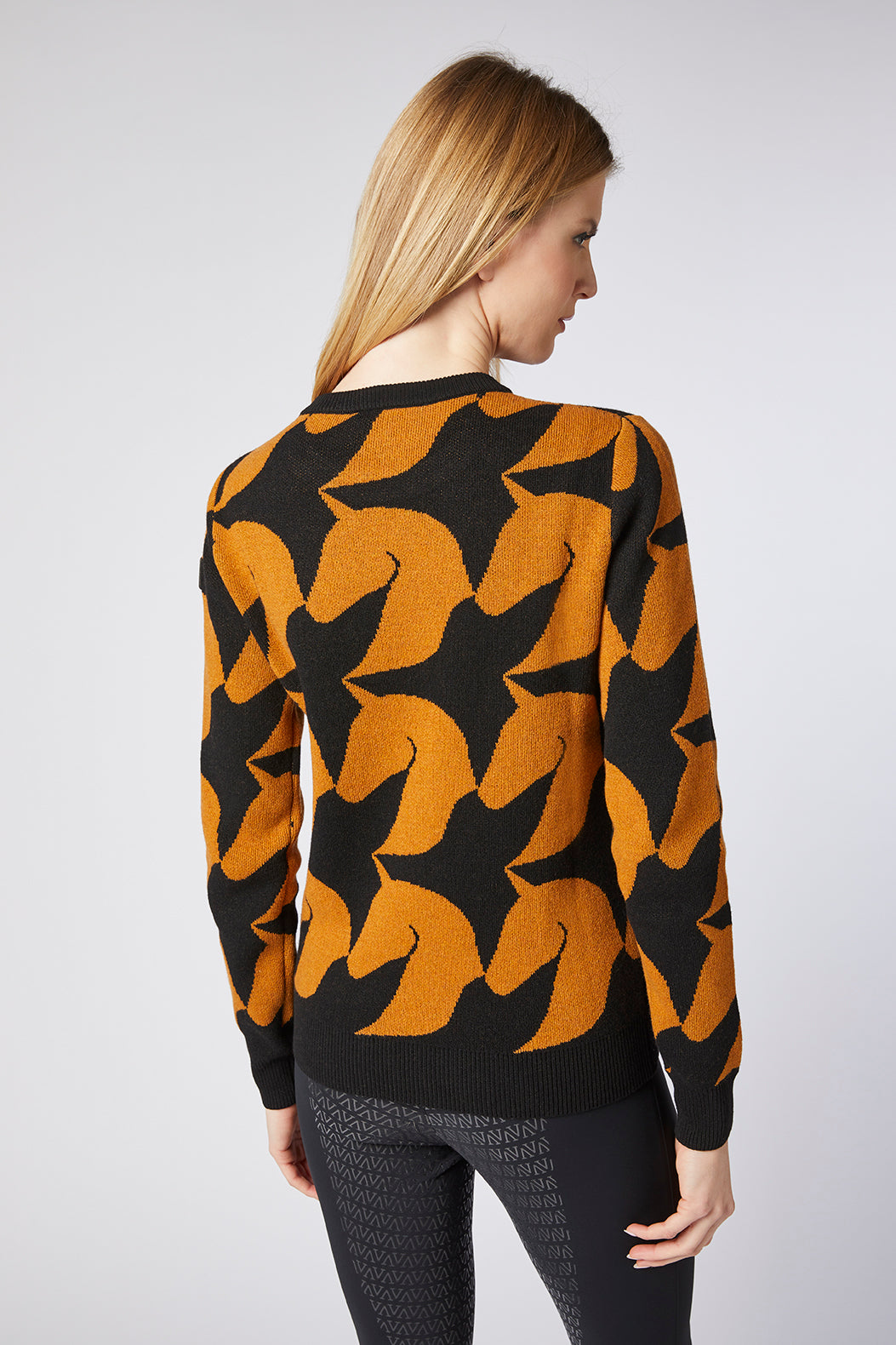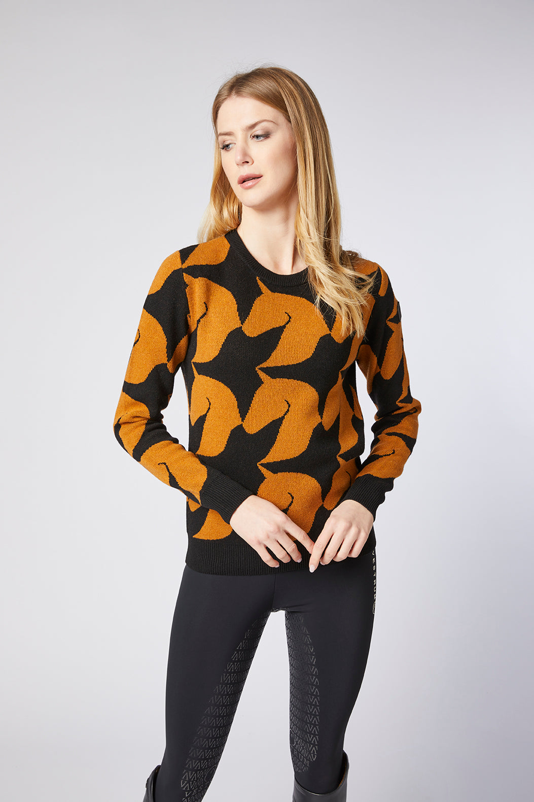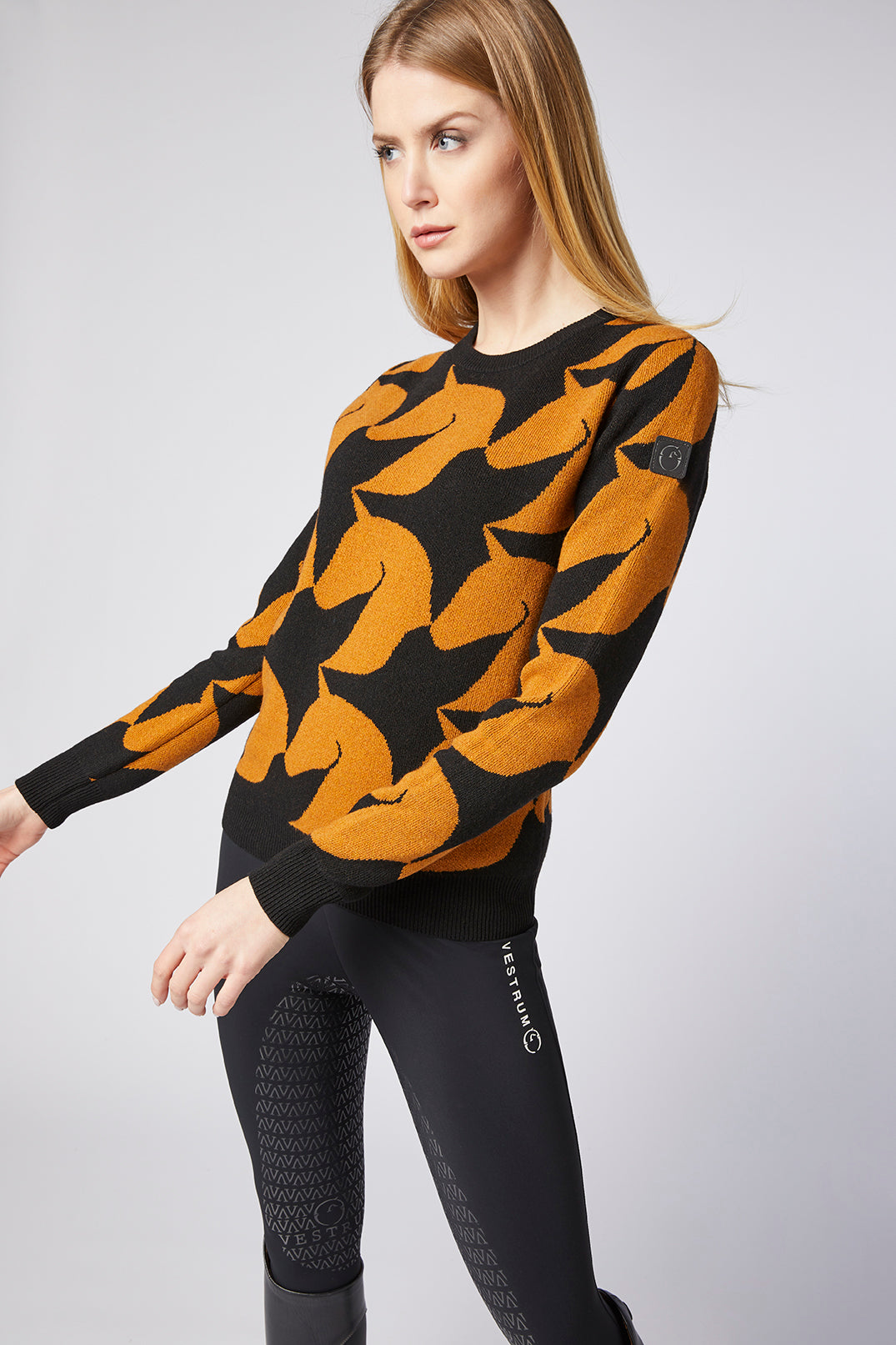 Vestrum Fianes Women's Sweater - This ladies round neck sweater featuring an abstract horse pattern in a turmeric color is made of wool and cashmere blend. This piece of women's knitwear does not only have a luxurious look, but also a very warm, soft and luxurious feeling. Designed and made in Italy, the Fianes sweater perfectly combines equestrian sport and high fashion, offering the stylish equestrians and all horse lovers the perfect outfit for this winter.