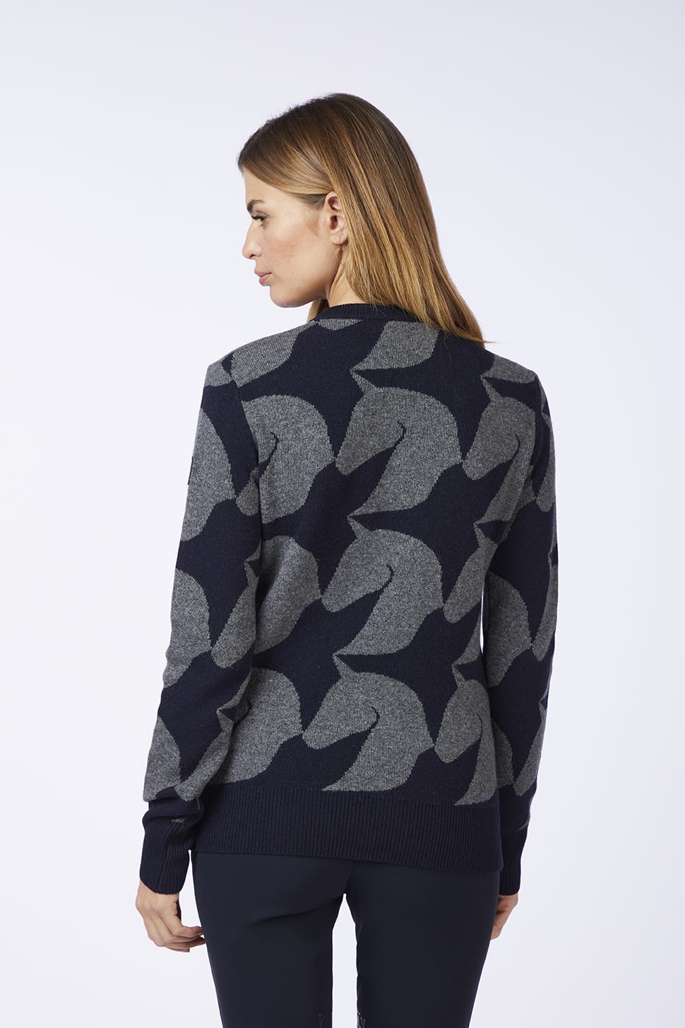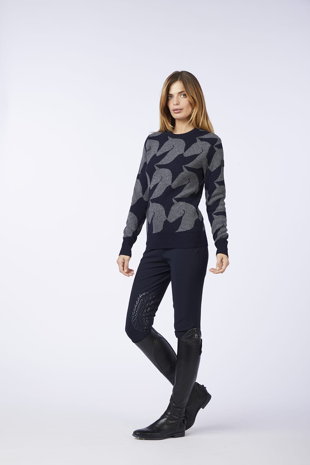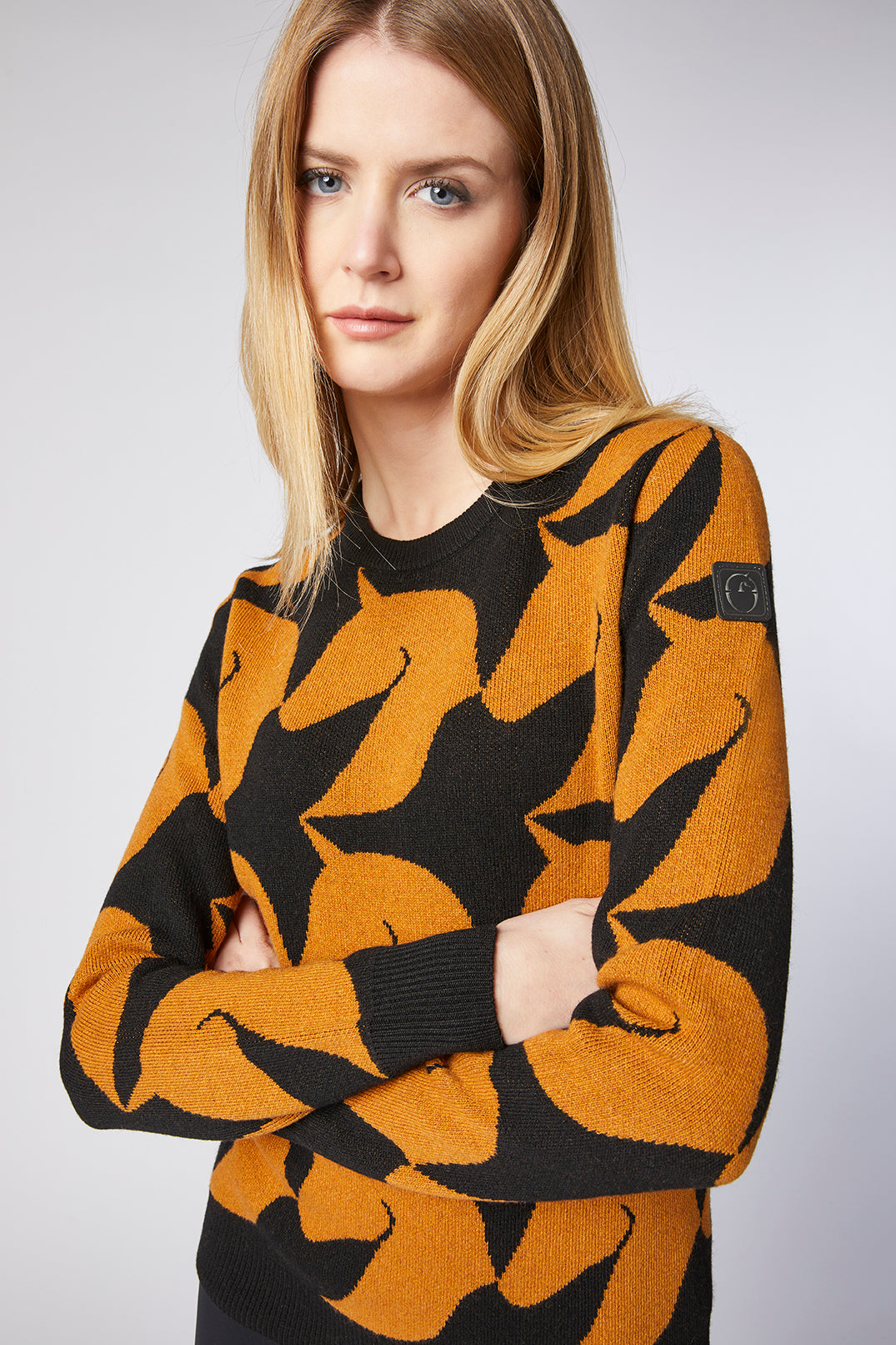 Vestrum Fianes Women's Sweater - This ladies round neck sweater featuring an abstract horse pattern in a turmeric color is made of wool and cashmere blend. This piece of women's knitwear does not only have a luxurious look, but also a very warm, soft and luxurious feeling. Designed and made in Italy, the Fianes sweater perfectly combines equestrian sport and high fashion, offering the stylish equestrians and all horse lovers the perfect outfit for this winter.