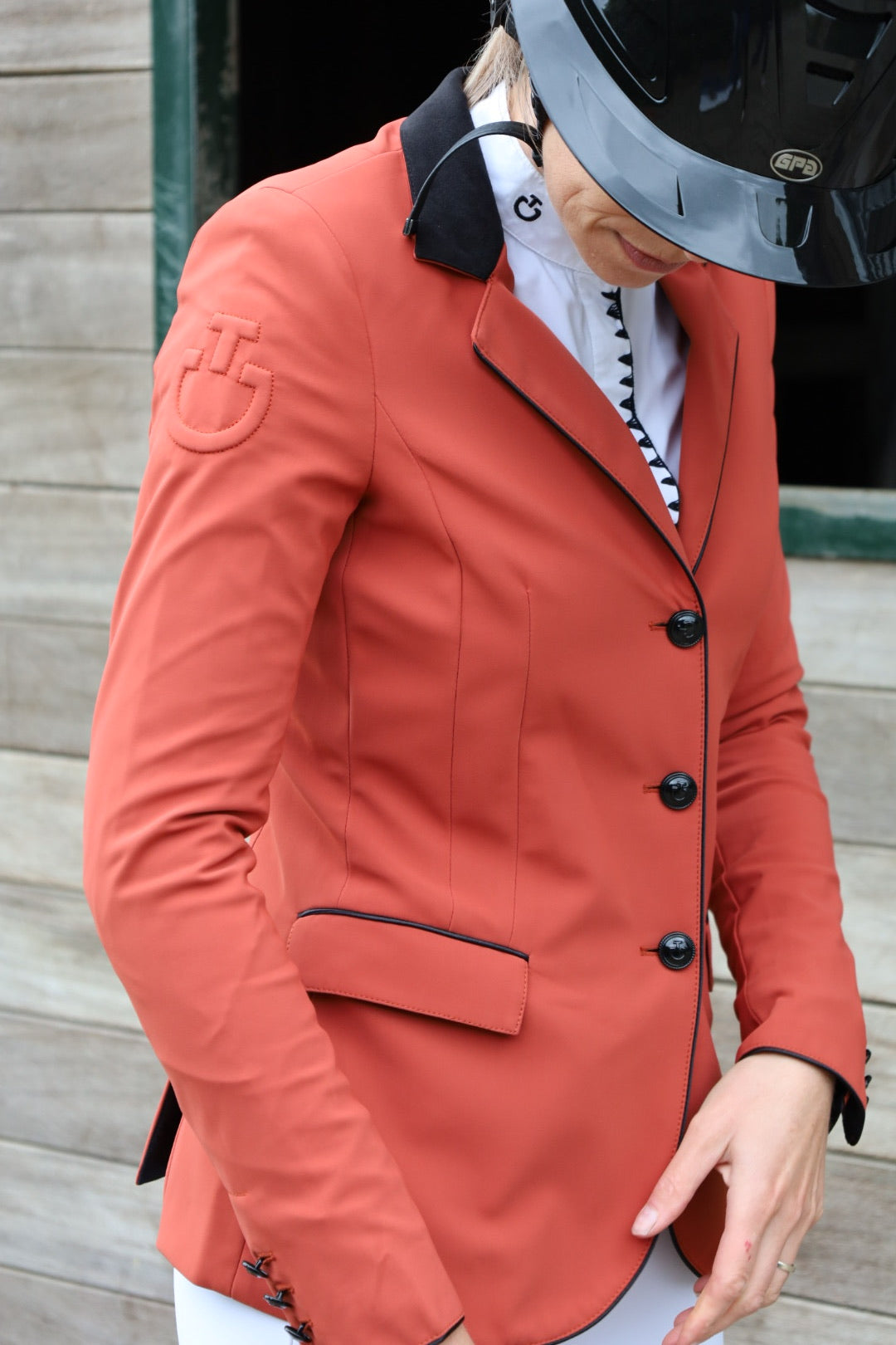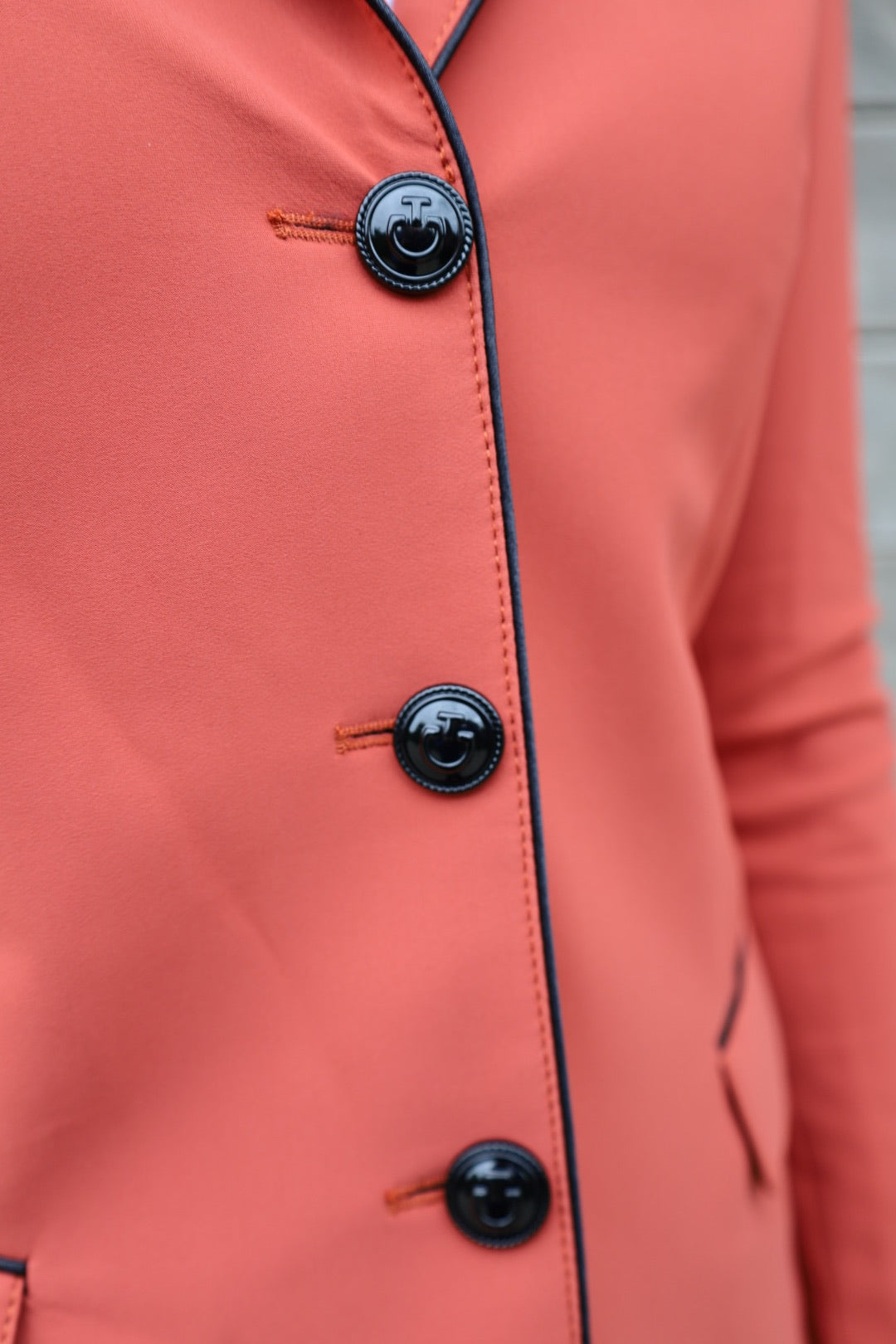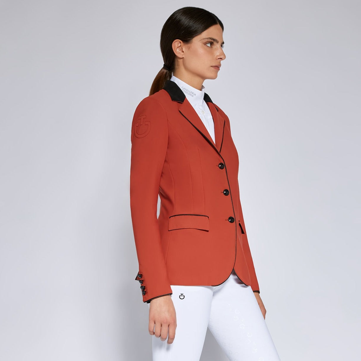 Cavalleria Toscana Damski Frak Konkursowy Grand Prix CT- Zachwycający konkursowy frak dla pań w unikalnym spalonym pomarańczowym kolorze, nadający stylowy wygląd. Ten piękny, konkursowy frak oferuje klasyczny wygląd na ringu, łącząc nowoczesną technologię i funkcjonalność dla doskonałego komfortu i wydajności. Elegancki, klasyczny krój tworzy idealną sylwetkę w siodle, z podwójnym rozcięciem dla doskonałego dopasowania. Wyrafinowany kołnierz z Alcantary i kontrastujące, czarne wykończenia na kieszeniach i lamówce dodają elegancji.