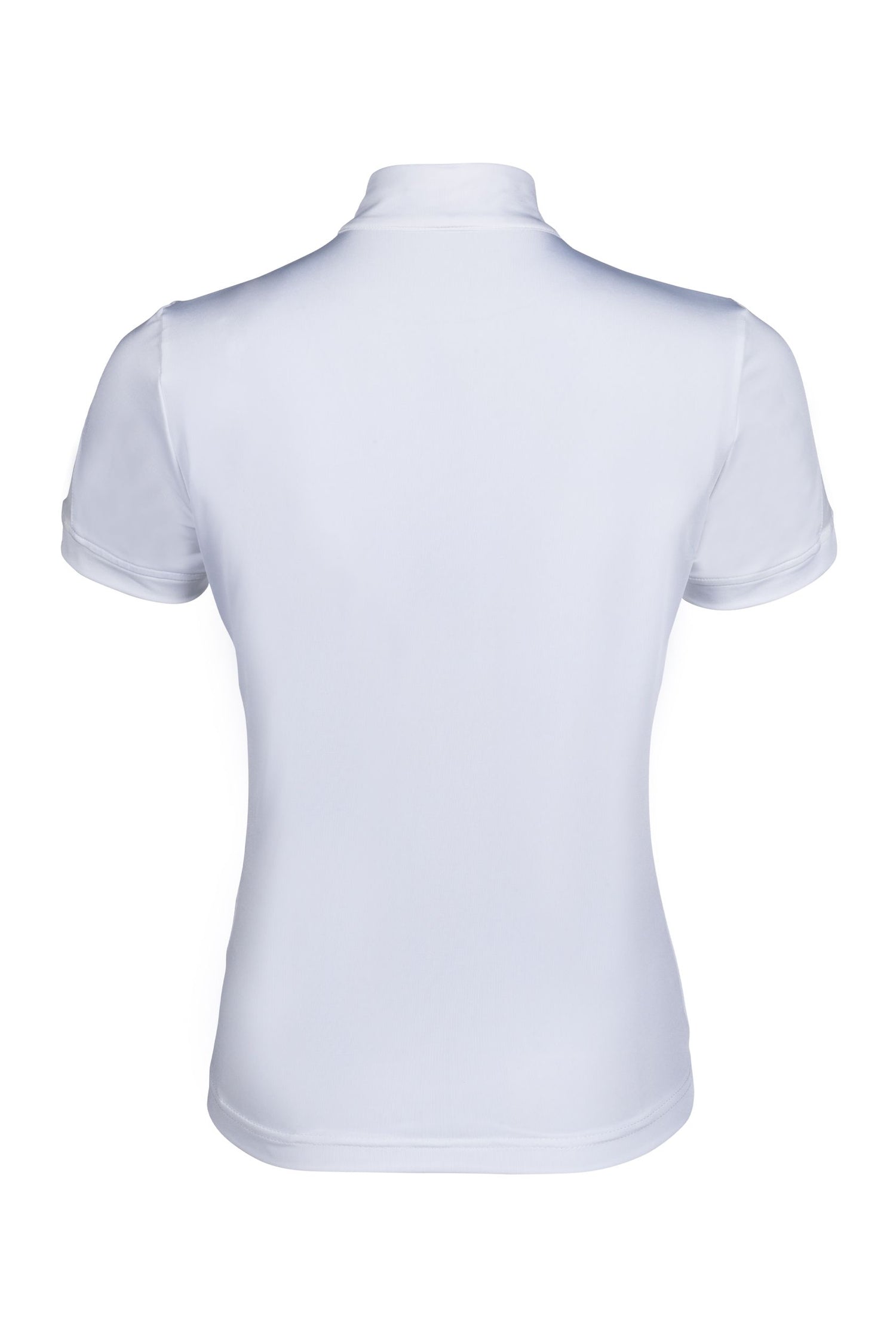HKM Women´s Competition Shirt Kayla - this gorgeous short sleeved women's show shirt offers style and comfort. Featuring mesh inserts on the chest and arms as well as diamond detailing on the front it is a true head turner. Made from highly breathable fabric to keep you cool on warm days, the shirt is elasticated for complete freedom of movement. The crisp white collar ensures it is competition legal, whilst the hidden button placket adds an elegant look.