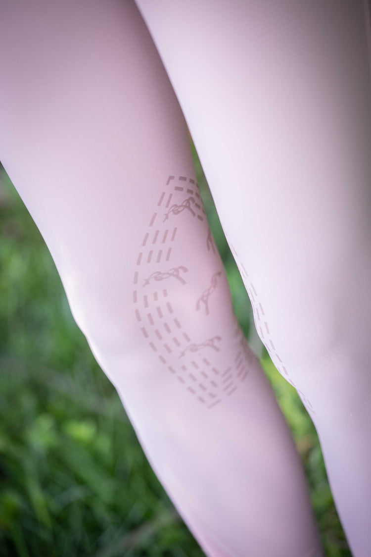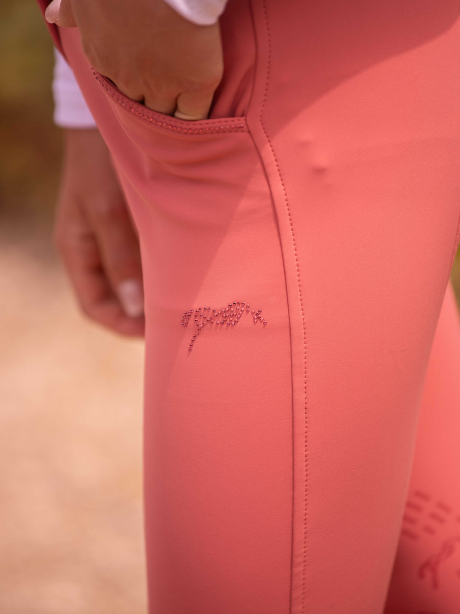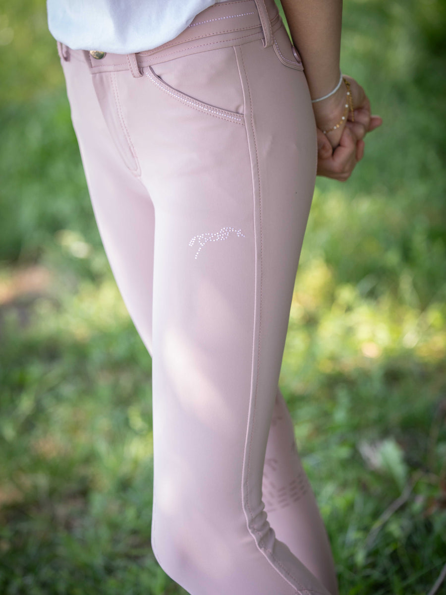 These breeches boast a beautiful row of rhinestones adorning the waistband, front and back pockets, adding a touch of glamour to the riding ensemble. At the heart of the design is the charming little Penelope horse logo, delicately placed on the left thigh and highlighted with rhinestones, showcasing a unique blend of elegance and equestrian spirit.