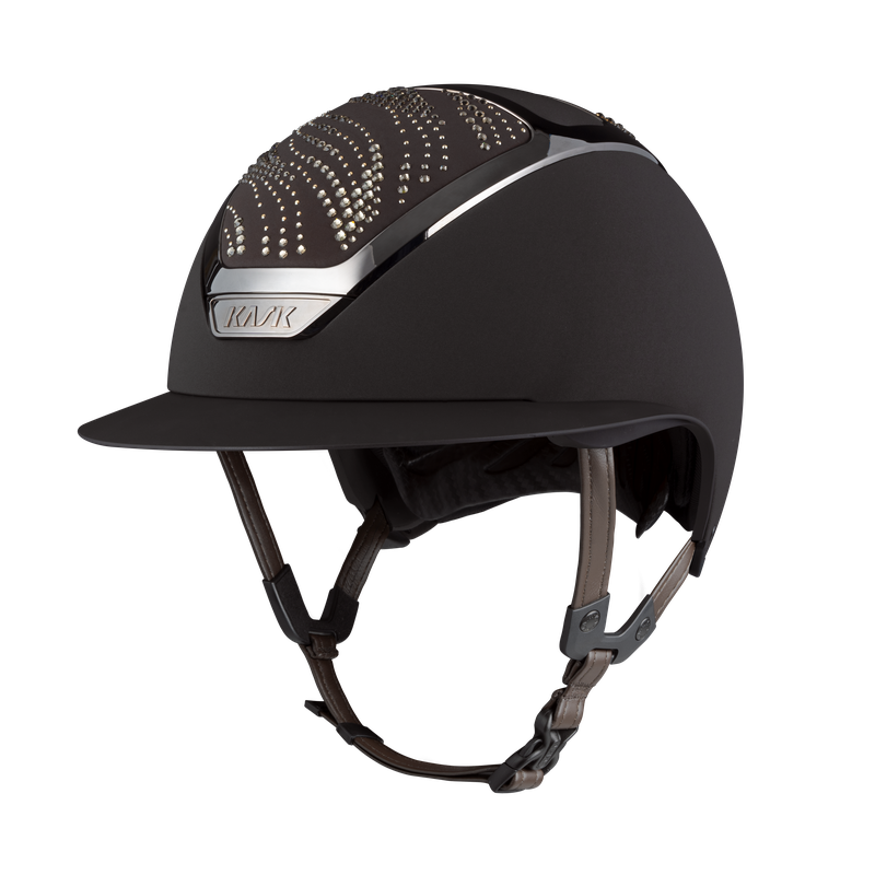 Kask Riding Helmet Star Lady Chrome Flow - this gorgeous riding helmet for lady equestrians offers luxurious style and exception comfort. Featuring Swarovski crystals in a stylish design, this helmet is a true head turner. With its wide peak for extra sun protection, the Star Lady guarantees comfort, safety and high performance all while remaining incredibly elegant. Characterized by its shining frame, the Star Lady is a unique helmet that you will fall in love with. Choose from various color combinations to perfectly match your competition outfit.