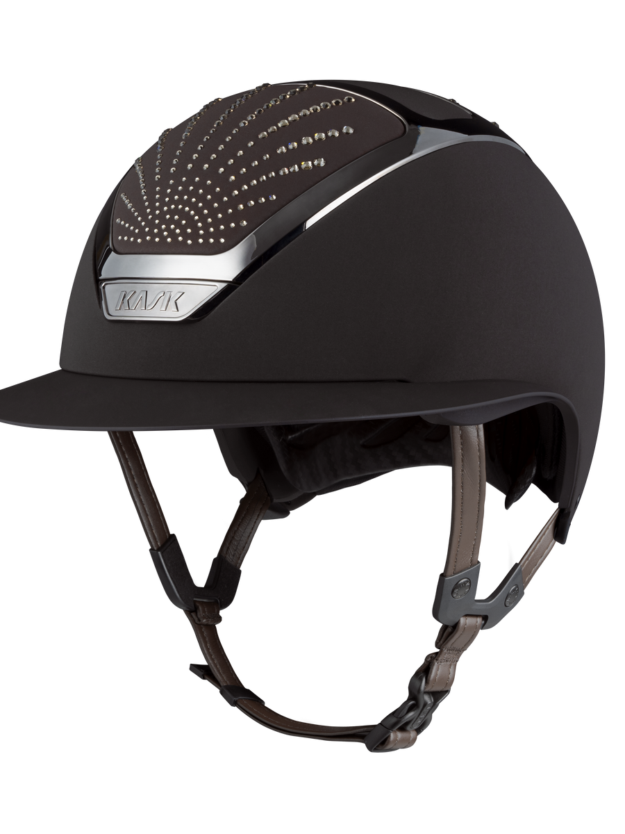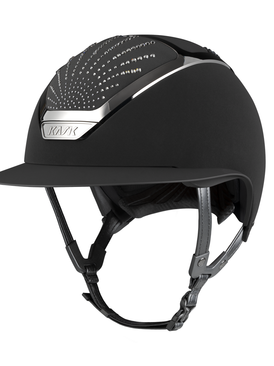 Kask Riding Helmet Star Lady Chrome Origin - this gorgeous riding helmet for lady equestrians offers luxurious style and exception comfort. Featuring Swarovski crystals in a stylish design, this helmet is a true head turner. With its wide peak for extra sun protection, the Star Lady guarantees comfort, safety and high performance all while remaining incredibly elegant. Characterized by its shining frame, the Star Lady is a unique helmet that you will fall in love with. Choose from various color combinations to perfectly match your competition outfit.