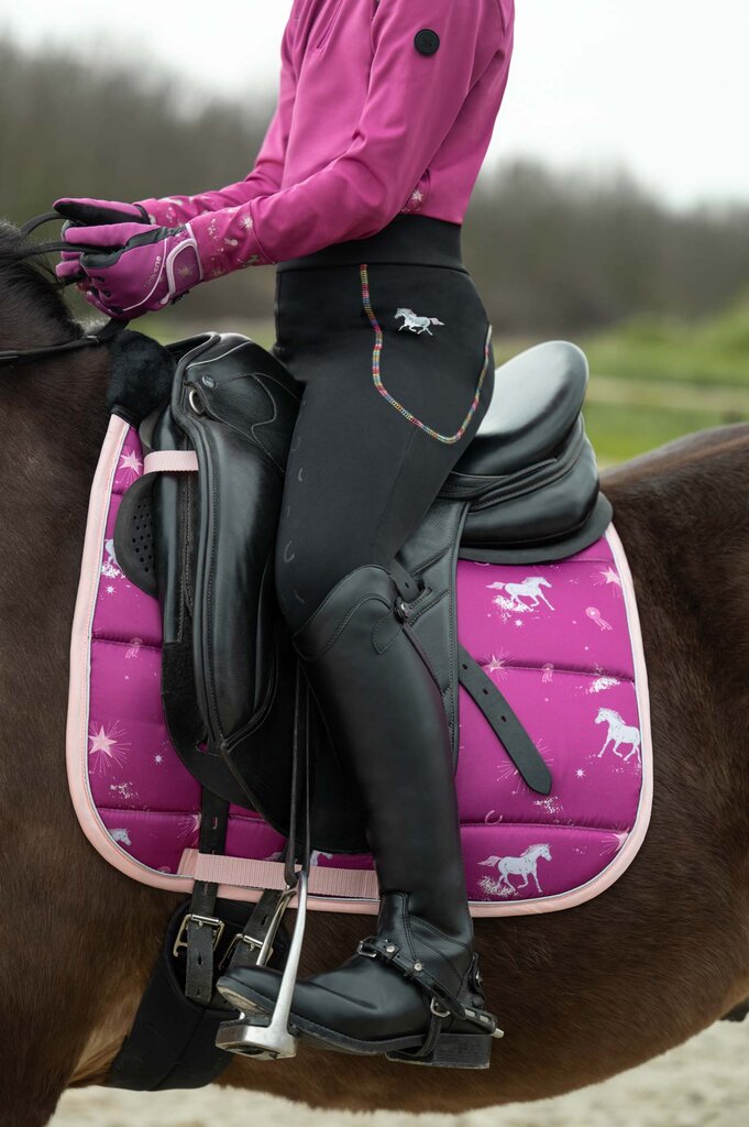 Decorated with a horse motif print these leggings match perfectly with the other products from the HKM Polly Kids Collection. The elasticated waistband and comfortable elastic ankles make them easy to slip on and off, allowing for hassle-free transitions, while the silicone full seat gives your kid a good grip in the saddle.