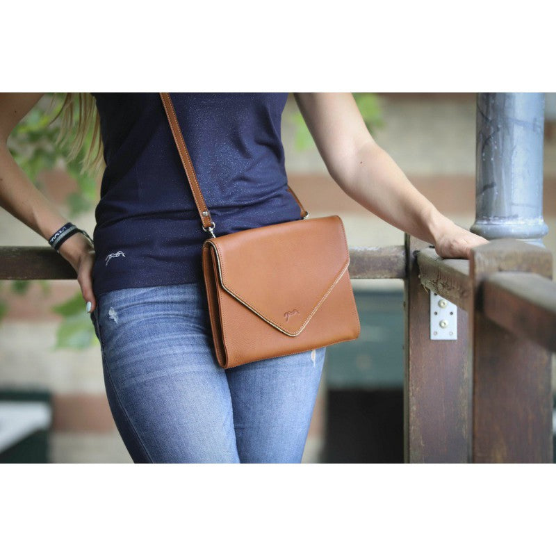 Penelope Laure Envelope Bag - To carry on your hand, or over your shoulder. The strap can be adjusted however you want to. Laure has a V shape flap, just like fancy envelopes, and the V shape comes with a gold piping around it, contrasting with the black or brandy leather. Pénélope logo is embossed on the bottom of the flap.