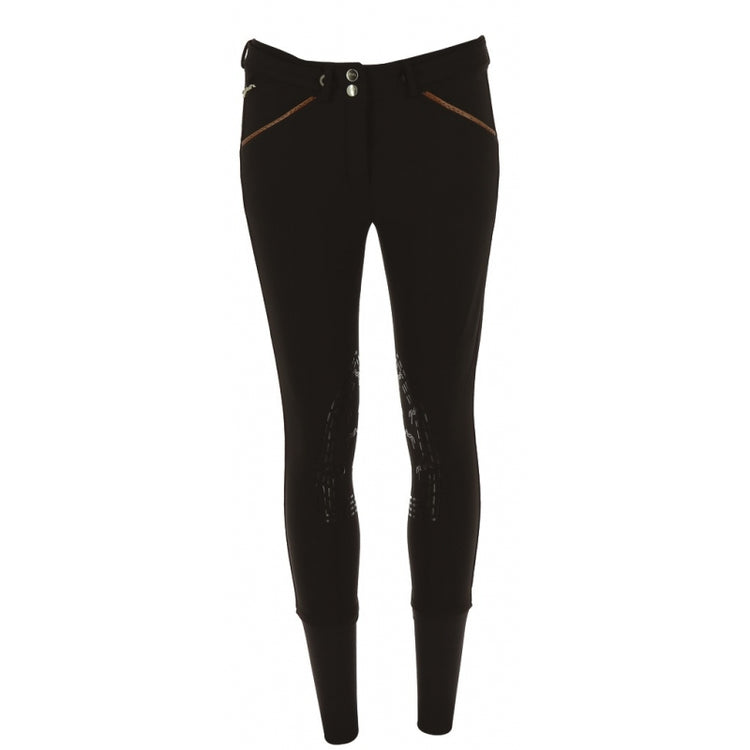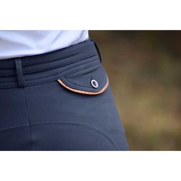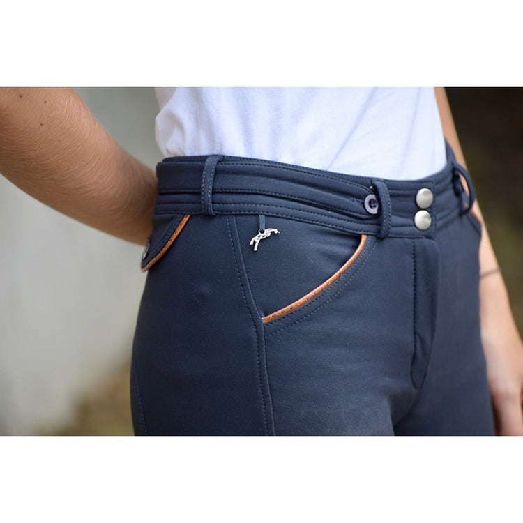 Penelope Children's Breeches Point Sellier with Silicone Knee Grip - super soft and comfortable girls' horseback riding breeches with sporty yet feminine design. Super soft and sticky silicone knee grip for extra comfort and security in the saddle. The breeches offer a mid high waist for an excellent fit and superior comfort. Stylish saddle stitch detailing around the front and back pockets give the breeches a special look whilst the Lycra ankle ensures less bulk under your boots or chaps. A Penelope pendent and a thin over-belt with two buttons on the waist add a feminine touch to these breeches.