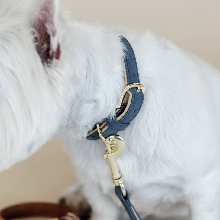The vegan leather used is extremely soft and supple, making it perfect for sensitive dogs that get chafed easily. Maximum comfort is achieved not only by the softness of the collar, but likewise by its lightness. The final touch is given to the collar by the fittings made of gold-plated brass.