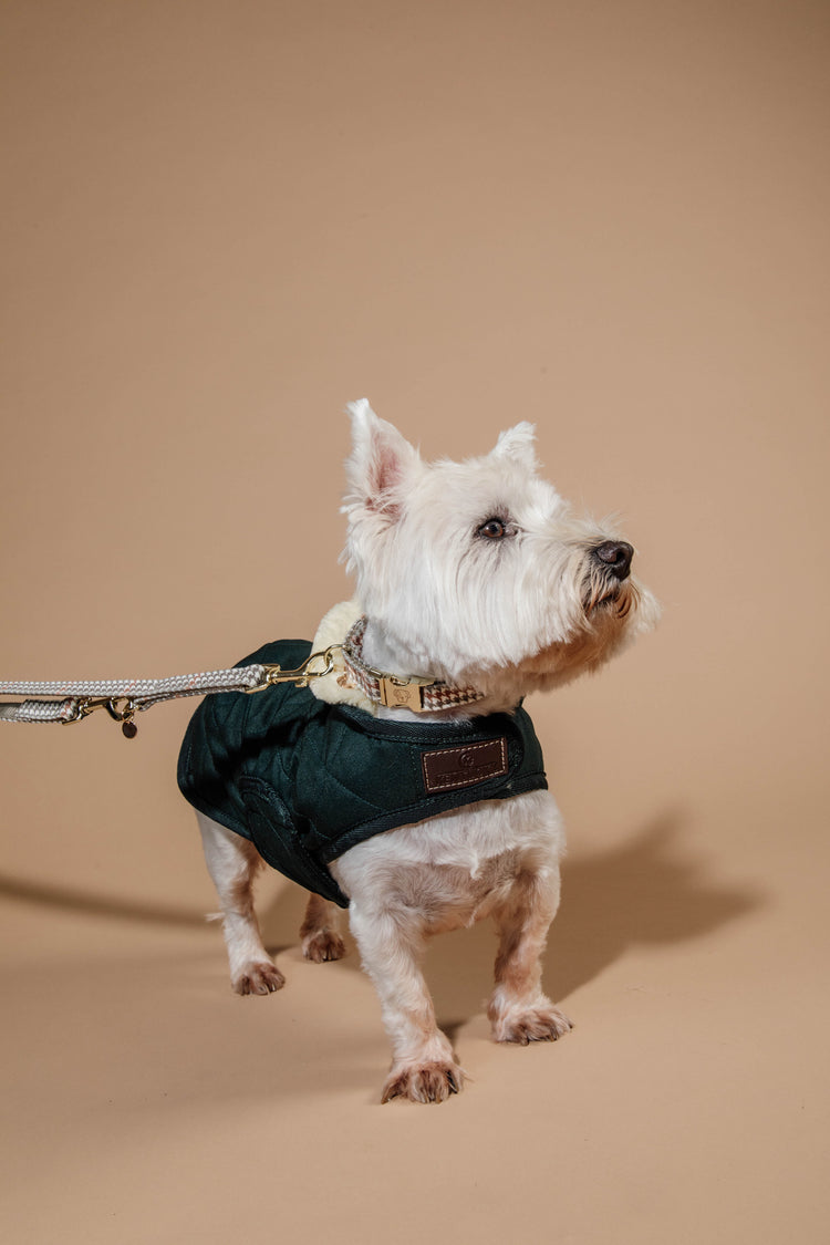 The diamond quilting ensures a classical look together with the Velcro front closure covered in artificial leather, same as the closure on the belly. The outer fabric is made of 1000D High Tenacity Polyester and the Dog Coat has been specially designed to sustain the washing machine at 30° (no dryer).