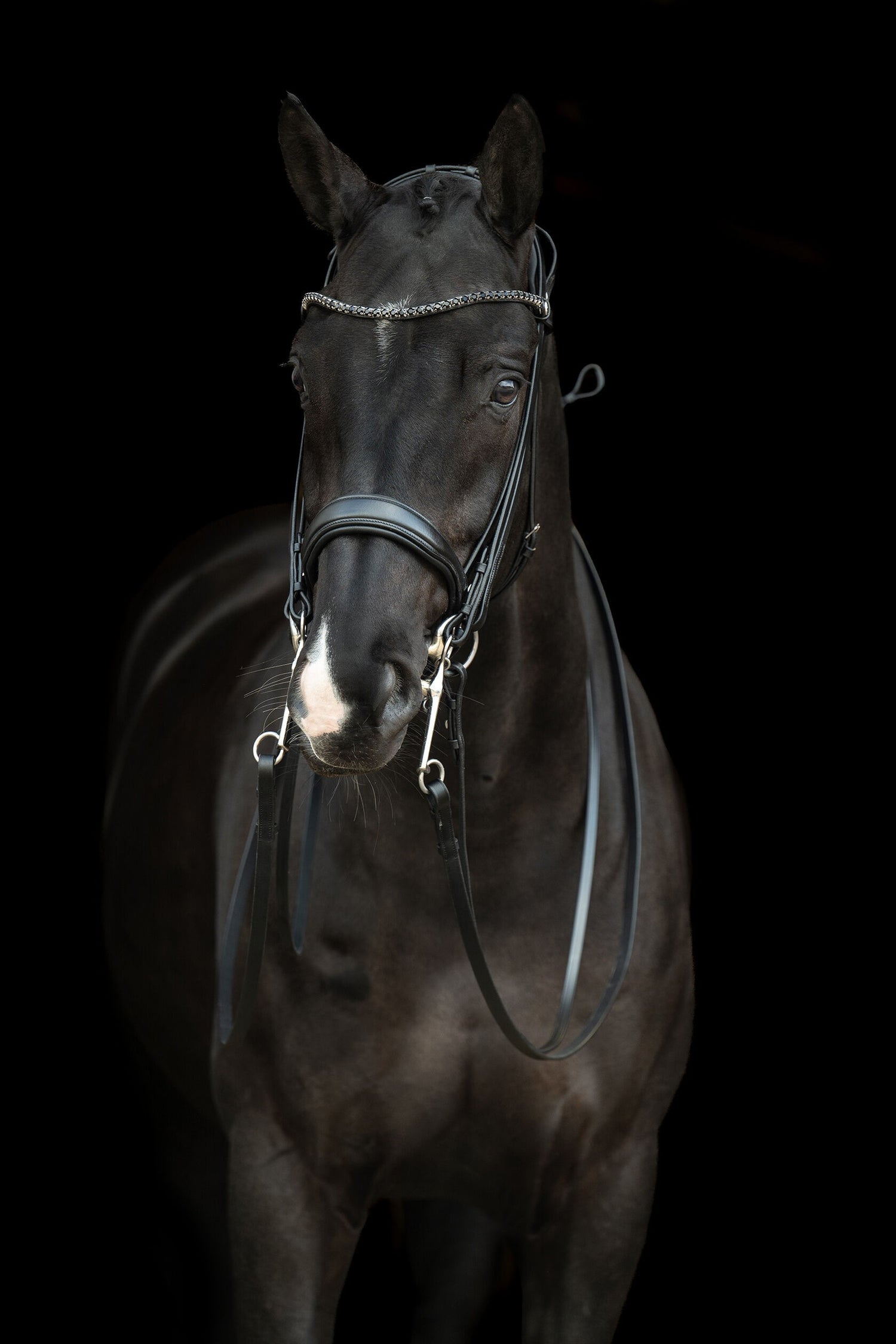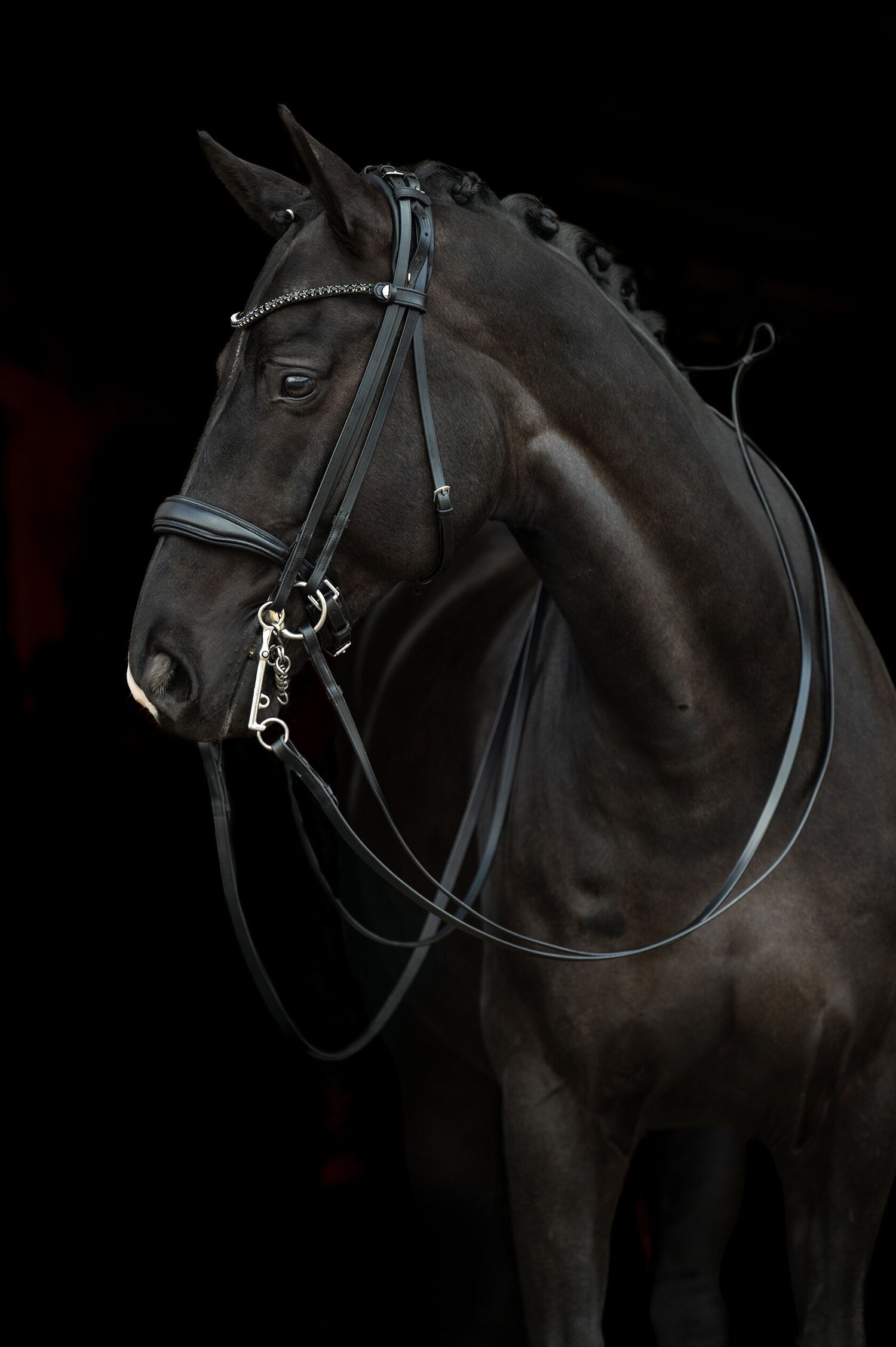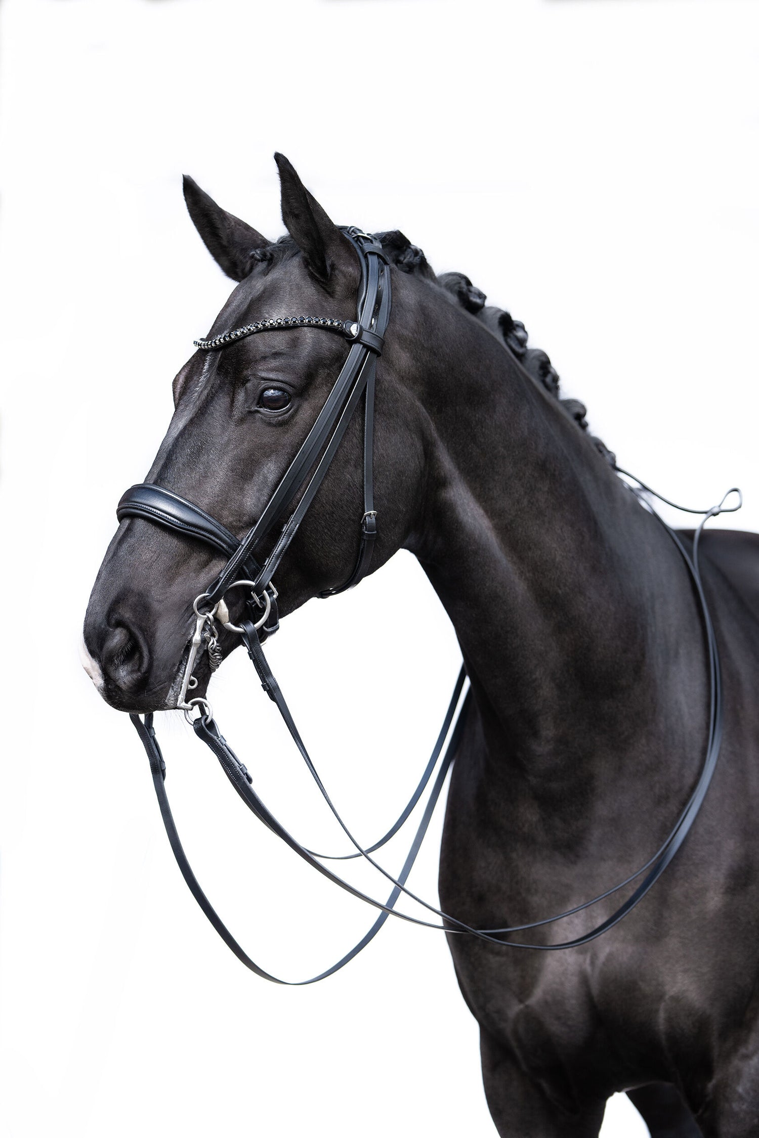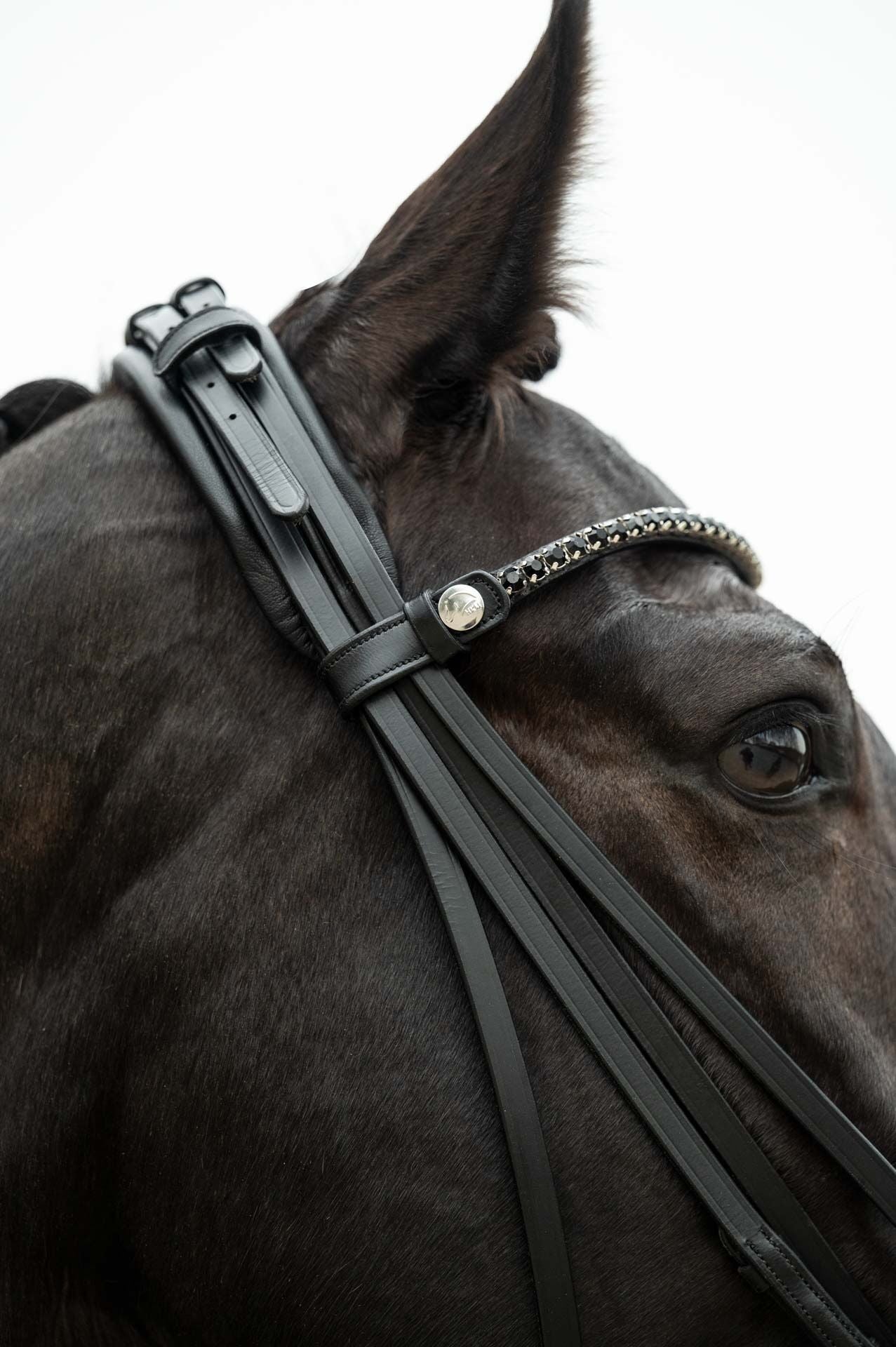 HKM Double Bridle Grace - this double bridle from HKM features adjustments on the poll for reduced bulk on the side of your horses face. Delivered with two pairs of leather reins, the bridle has a softly padded headpiece and noseband for your horse comfort-. A shiny curved browband with big stones adds some sparkle, whilst the browband can quickly and easily be changed thanks to the snap fasteners.