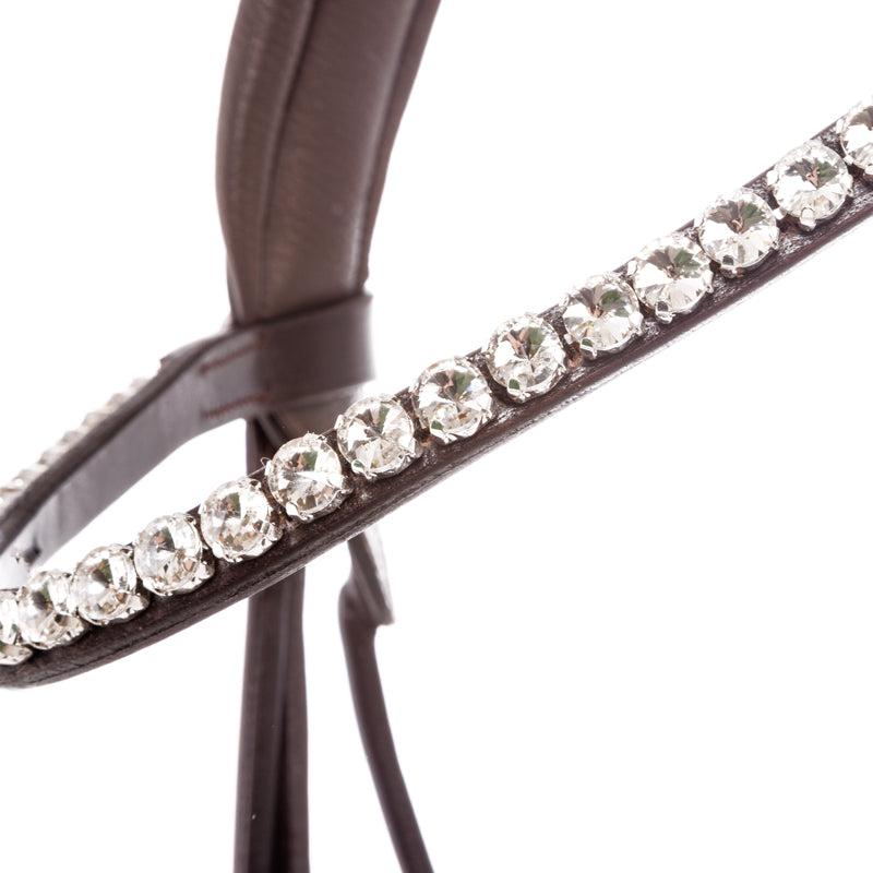 Kavalkade Weymouth Bridle Fleur" - this round leather double bridle features adjustments on the headpiece to reduce bulk on the side of your horses face. Made from high quality German leather, it impresses with it's elegance and performance. The round sewn cheek pieces together with the curved browband with large white rhinestones and the noseband in patent leather give the bridle a stunning look. An anatomically shaped headpiece ensures a high level of comfort, whilst the angled throat latch ensures it lays flat.