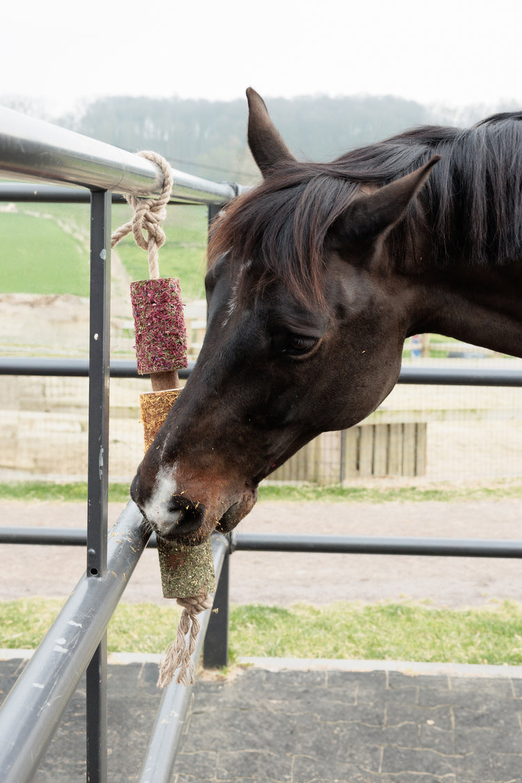 If your horse tends to get bored standing in their stall, this Relax Horse Toy is the ideal stable buddy! It is made from 100% organic, untreated pine and birch wood, offering a completely natural way to keep stabled horses mentally engaged. Designed to stimulate the senses, it uses the wood’s natural textures and forest scents to encourage chewing and exploration—mimicking behaviors horses would naturally display in the wild.