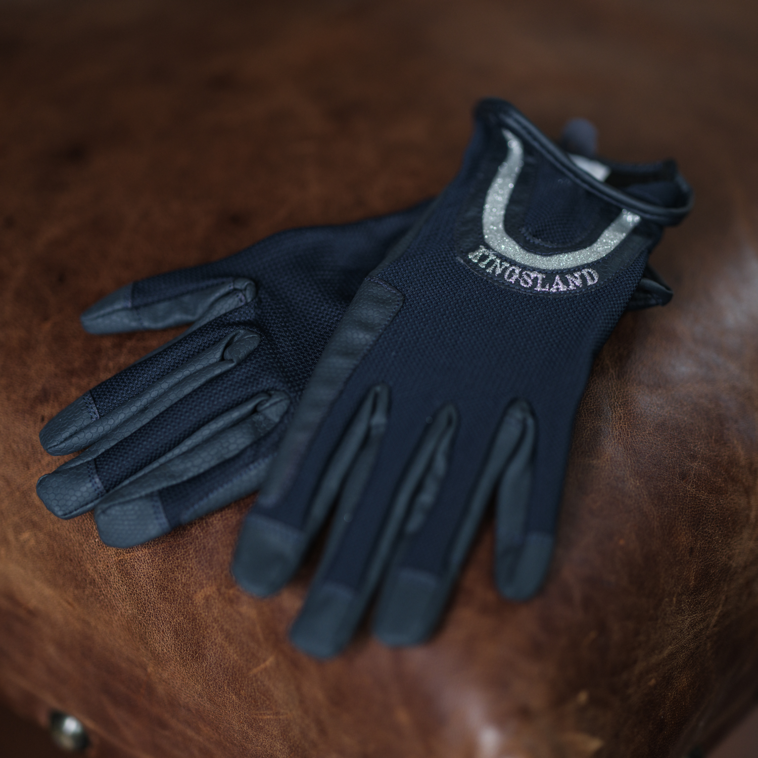 Kingsland KLcaia Summer Riding Gloves - super lightweight mesh material on the entire back of the gloves - perfect for riding in the summer! The palm and fingers are made of classic synthetic PU leather to provide excellent grip, protection and durability. The touch screen compatible material on the thumbs and index fingers make it super convenient to use your phone without having to take the gloves off. The round strip on the back with embroidered Kingsland logo and edging in sliver glitter make the gloves extra chic and stylish.