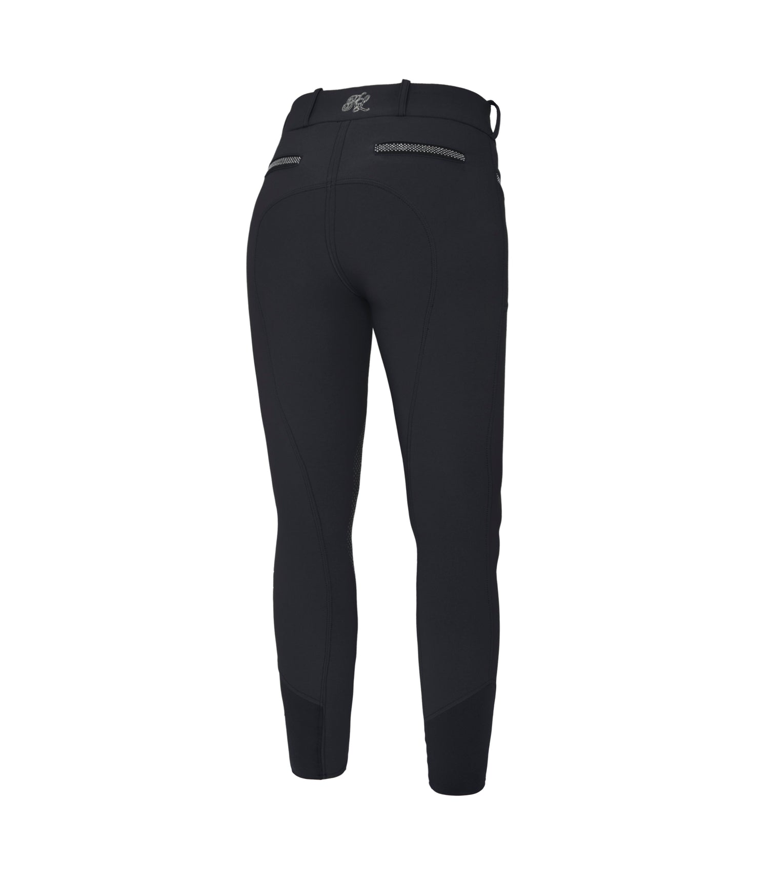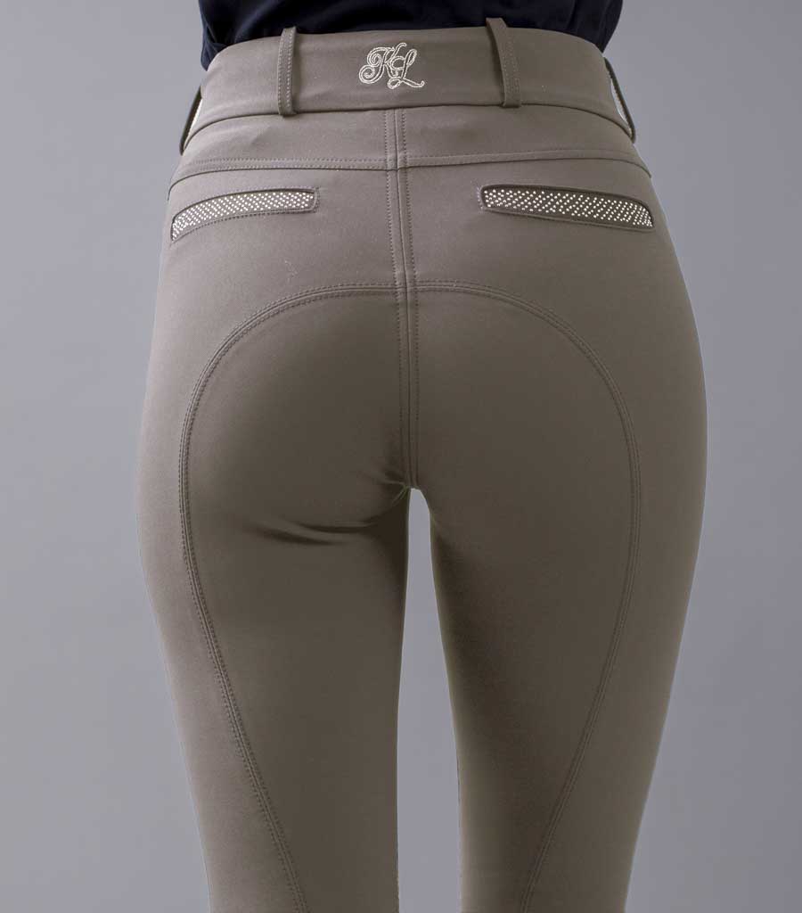 Kingsland KLkadi Women's E-Tec Knee Grip Breeches - these stunning ladies' riding breeches feature two front pockets and two faux back pockets. Shiny small crystals are lined on all the pockets. Kingsland embroideries sit over the left front pocket and the center of the back. These breeches close with two front buttons that also have a big crystal design.