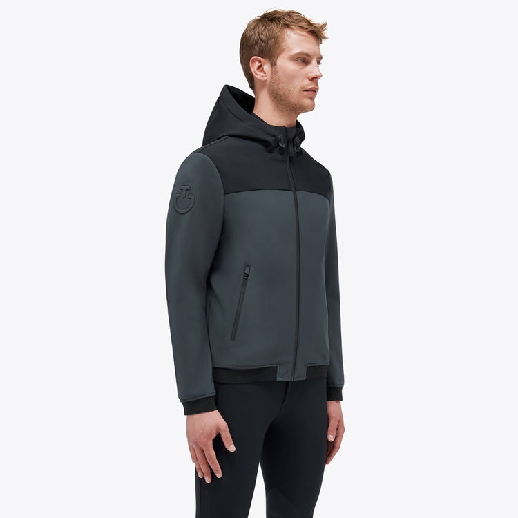 Cavalleria Toscana Men's Jersey Hooded Softshell Jacket - designed for the modern male equestrian, this Cavalleria Toscana men's softshell jacket blends luxury and practicality, making it an essential for cooler days. This high-quality jersey softshell boasts a hood and velvet lining, ensuring unparalleled comfort with a luxe touch. Its central closure features a water-resistant zipper with a sleek black matte finish, offering robust protection from harsh elements. The zipper pull, designed for convenience and style, is thoughtfully positioned on the lined side. Additionally, the jacket's pockets are equipped with water-resistant zippers, safeguarding your essentials. Adorning the right sleeve is the distinguished CT logo, a testament to the garment's authenticity and superior quality. This Cavalleria Toscana softshell is the epitome of style meeting functionality, a must-have for those who value sophistication in their attire.