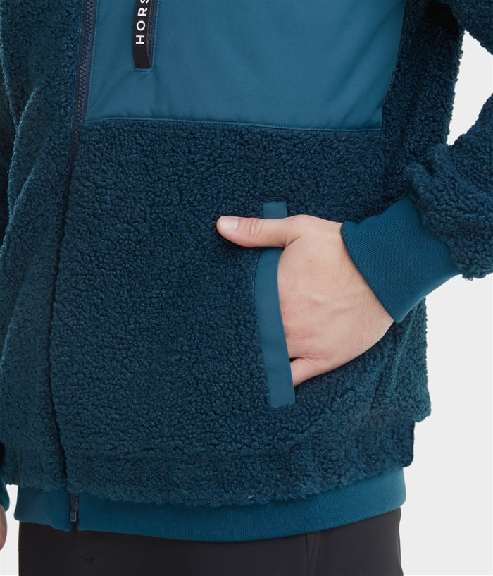 Horse Pilot Men's Sherpa Sweatshirt - a cozy and fluffy sportswear with bi-stretch material and bomber jacket shape that let you move around freely. A fabric reinforcement placed on the chest and back effectively protects against wear and tear due to repeated friction. The woolly structured sherpa material will keep you warm and comfortable.  Its design and fit have been developed to adapt to the movements of the rider on horseback. The front zip makes it easy to put on and off. Three zipped pockets on the front are very practical cause equestrians know that the pockets need to be closed properly so things don't fall out while riding. The elastic waistband and cuffs give the sweater a cool fit and also prevent the wind from getting in. The strap with Horse Pilot logo on the chest pocket adds the final design detail to give the sweatshirt a designer look.