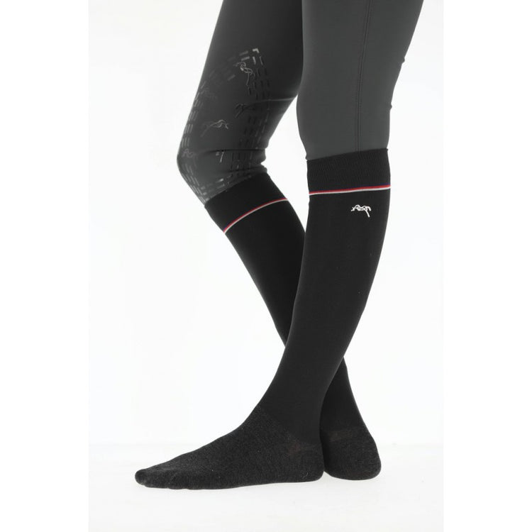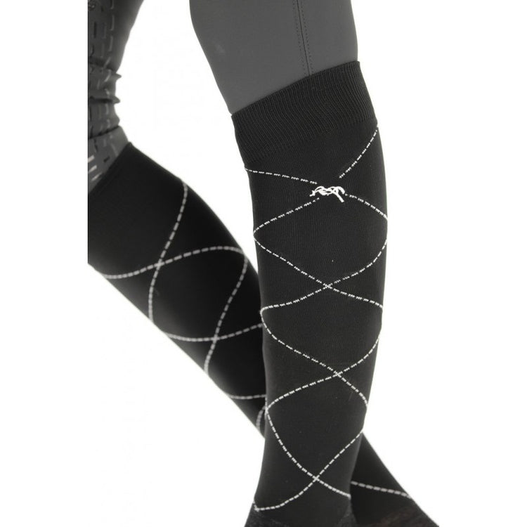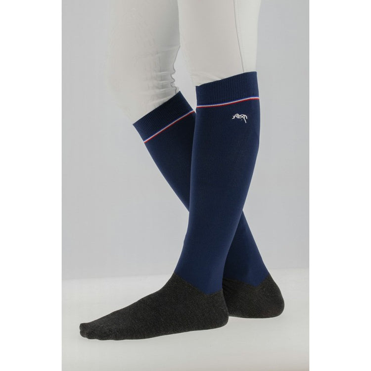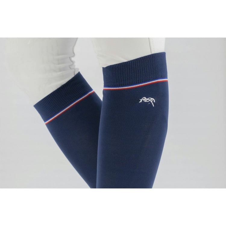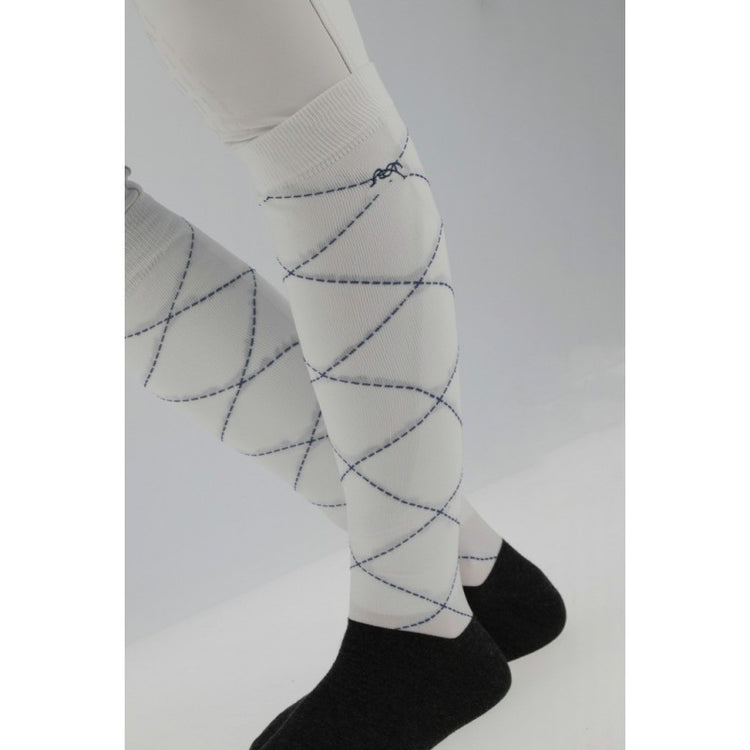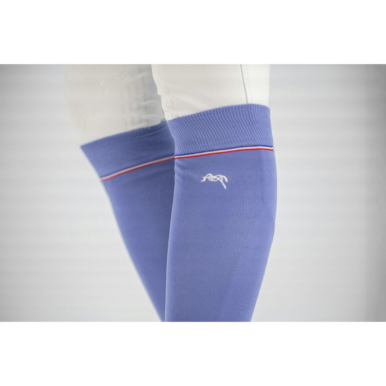 Penelope Luxe Socks - this two pack ladies riding socks include a pair of plain ones with thin red, whit and blue stripes on the top and a pair with diamond shape stitching. Both of them feature a Penelope logo embroidery in contrasting color on the top. Breathable and stretchy, the luxe socks are easy to put on and stay on the leg.