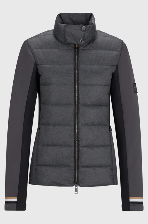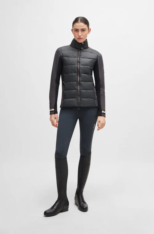 Boss Equestrian Women's Hybrid Puffer Jacket Ruby - this lightweight ladies jacket is perfect for in between seasons. Made from a combination of puffer and softshell, its designed for riding in thanks to the two way front zip. Signature stripes on the sleeve ends add a touch of color, whilst the extra high neck with button closures not only adds to the look, but will help keep you warm. The BOSS logo badge on the left sleeve adds the final touch to this functional jacket.
