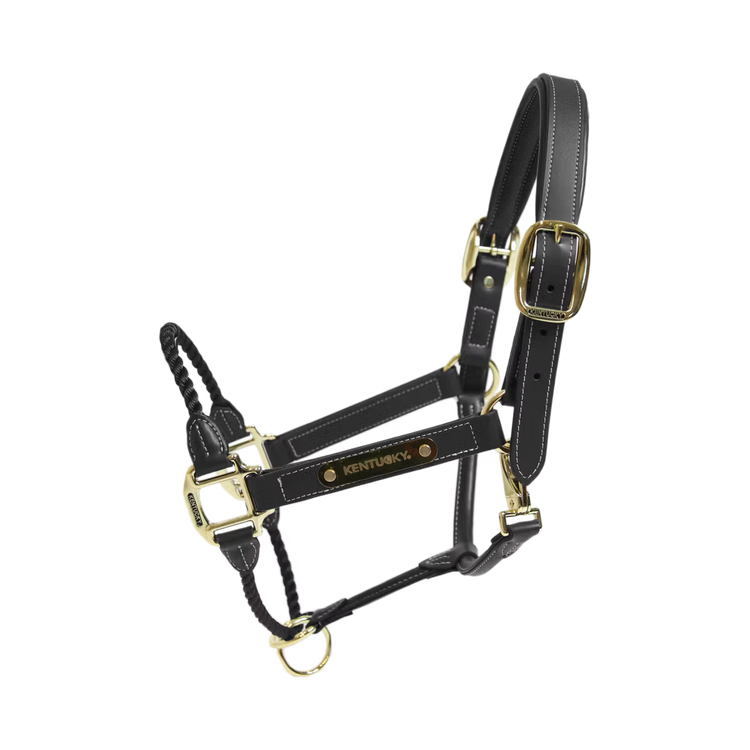 Kentucky Vegan Leather Rope Halter - the ultimate halter for the stronger horse. The Leather Rope Halter features a thick brown rope noseband which helps to have more control of horses who tend to have a lot of character on the ground. A fantastic looking halter, the main part is made from artificial leather that is sustainable, easy to clean and 100% animal friendly. The size can easily be adjusted on both sides of the halter for the perfect fit. The fittings are all gold to match the Kentucky Lead Ropes perfectly. Add a personalised touch by turning the name plate over and engraving it with your horses name.