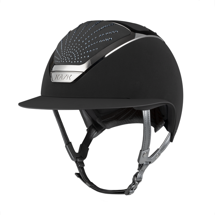 Kask Riding Helmet Star Lady Chrome Origin - this gorgeous riding helmet for lady equestrians offers luxurious style and exception comfort. Featuring Swarovski crystals in a stylish design, this helmet is a true head turner. With its wide peak for extra sun protection, the Star Lady guarantees comfort, safety and high performance all while remaining incredibly elegant. Characterized by its shining frame, the Star Lady is a unique helmet that you will fall in love with. Choose from various color combinations to perfectly match your competition outfit.