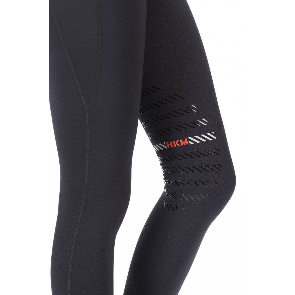 HKM Style Riding Leggings Sports with Silicone Knee Patch - a sporty yet cosy riding leggings. These tights are breathable and come with a brushed inside which keeps you warm - so the perfect leggings for a fresh autumn ride. The silicone knee patches ensure a great grip while riding and add a stylish detail. For your phone, these leggings have a pocket on the right thigh, that way your phone is with you but not restricting your movement.